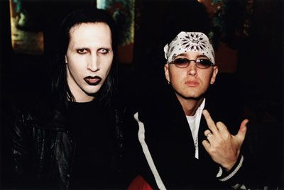 During a literary evening during which he signs his new book, while drinking absinthe and sitting beside the writer Anne Rice, the latter says jokingly: “He reminds me of my character Lestat the vampire rock star! I find his voice magnificent on the songs from The Queen of the Damned,which were adapted from my book The Vampire Chronicles.” Manson laughs. “I sure have some great fans; seriously, it’s like they awarded me the French Legion of Honor,” he jokes back. You can tell he’s quite at ease because he’s wearing his T-shirt, showing his numerous tattoos and dark rings, while observing the promotional activity with his gothic eye. “Yes, this is an individualistic world. People think they have freedom of speech, but it’s a trap because they are enslaved to television, which tells them what they need to watch and the products they need to buy to please others. In the end, it’s as dangerous as if someone told them: ‘you must dress like this and drive that kind of car.’ It terrifies them and makes them feel guilty. You watch the images of war on CNN when suddenly the commercial breaks start telling you what perfume men need to use to attract young women. That’s how it works. I believe that it’s simple manipulation disguised as capitalism which eventually turns out to be more dangerous than any dictatorship, because it drives you to control and censor yourself. You can’t say what you want to say because you’re afraid they’ll never air it on the radio. You refuse to wear certain outfits because you’re afraid they won’t let you into a restaurant or admit you to a school where you want to study. That, to me, is the height of hypocrisy. The same goes for the classification of the songs broadcast on the radio. The radio host plays the most demanded songs, but who really demands them? They make us believe that we chose the songs but it’s the management who impose the whole thing. You can easily feel lost if you don’t watch the news every day. I’ve always been against the propaganda of fear because I suffered too much from it during the Columbine tragedy, when the lies snowballed into an avalanche of negative attention. Someone made the mistake of saying that one of the kids was a fan of my music and next I found myself being accused of something I didn’t do. In part it’s because that’s how the American media works. They need a bad guy. Someone they can blame on the TV shows. Thus, people can sleep at ease. ‘Don’t worry, we’ll find the guilty ones. You can just relax and continue living your petty lives.’ And then, at one point, I was the scapegoat of the week. I’m sure it’ll happen again. So it is easy for me take a stand against America, because I think I need to remain faithful to my opinions and to myself, and I always have tried to do so. I have always questioned my country’s faults and praised its advantages, even if my ideas have nothing to do with patriotism. As an artist, I must defend democracy and fight for freedom of expression in a country where deceit is clearly the rule and where censorship is common. But if I must fight one thing, I choose to fight censorship. Thus, fatally, my work of artist becomes even more pertinent, especially these days. They continue censoring my words or images or my music, thus, in reality, there is a real hypocrisy on the part of the government, and my role is to challenge this. If America represents democracy, I represent freedom of speech. I didn’t invent violence. Nor did the Columbine kids. Humanity has this tendency, this self-destructive tradition and that’s something I’ve always mentioned in my songs. So, it’s rather curious they should point their finger at me because all I say, all I sing is just a comment about this sad reality.” He drinks some more absinthe. He seems serene and relaxed in front of the hordes of fans who knock each other about trying to get him to sign their copy of his book. “If I’m divided between being witty and talking crap with the journalists in a TV studio,” he admits to me during a break at his stand, “it’s because I’m different depending on how I feel about the hosts. If they are conservative, conventional and distant, I shyly huddle up and answer politely hiding behind my clothes, but keeping my self-control above all. If the guy’s really well-informed about me and talks to me as an artist who defends his work, I really relax knowing I won’t be judged by frustrated puritans and then I want to entertain the audience with humor, playing around with the reputation of my persona ‘Marilyn Manson’.” Upon returning to the hotel, he plays with his cat and looks at his schedule. “I’m rather busy for a rock-star Priest! In the US, in the conservative States, preachers always have their bibles on them when they go out. Even when they go to the mall, in case they find themselves with the dogmatic obligation of exorcising a Metallica or Iron Maiden fan at a record shop on the verge of buying some devil music….they must always be on guard! I confess and preach in front of the media cameras. There I don’t need my bible. The TV talk show hosts know me and call me Reverend when they greet me,” he says laughing. He shows me his bible, which he keeps safely in his luggage, and then we shake hands and take leave of each other.